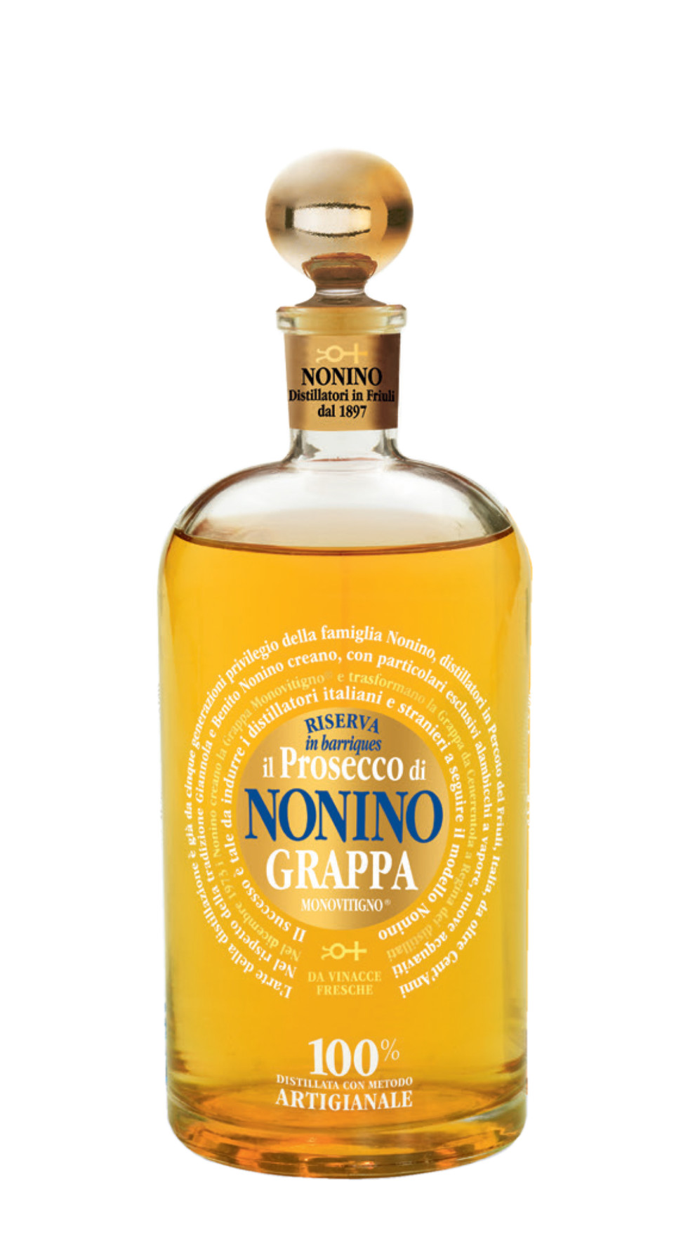 La Grappa Riserva Nonino di Prosecco, invecchiata per 24 mesi in barrique, è un distillato elegante, ricco e intenso, ottenuto da vinacce fresche di uve Glera. Aromi di fiori, frutta bianca e mandorle si uniscono a sfumature di vaniglia, legno e cioccolato in un assaggio morbido, caldo, equilibrato e persistente